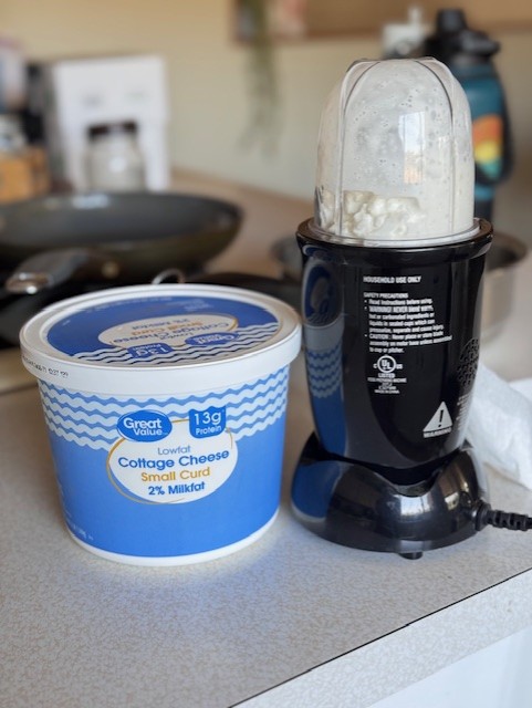 - While the pastaโs cooking, blend your cottage cheese until smooth and creamy. (This gives the sauce a rich, creamy texture without the heavy cream or extra calories.)