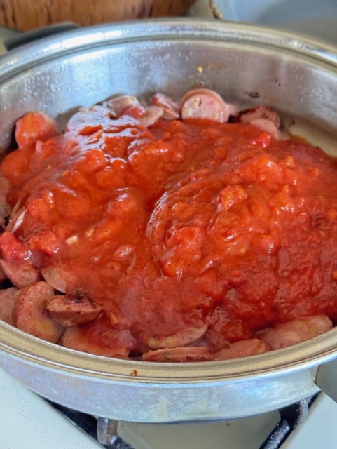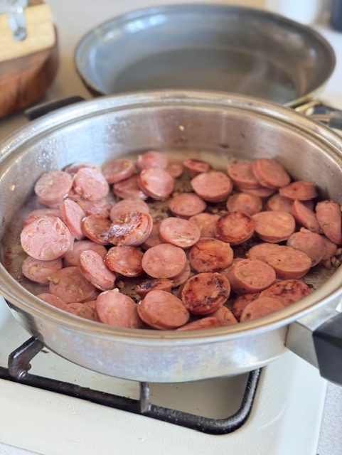 - In a hot skillet, brown the sausage for a few minutes until it gets a light crisp on the outside.